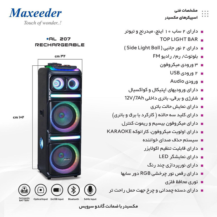 کنترل دستگاه به وسیله نرم افزار BT MATE توسط تلفن همراه-قابلیت اولویت میکروفون (Microphone priority)قابلیت حذف صدای خواننده (Accompany)دارای کلید سه حالته (باتری، خاموش، برق شهر)دارای 2 نور جانبی جدید-دارای چرخ برای حمل آسان-دارای باتری 12 ولت -دارای دو ساب 10 اینچ دو میدرنج و دو تیوتر -قابل حمل-نمایش حالت باتری-دارای بیس و تریبل و اکولایزر-دارای اکو و ولوم میکروفون -دارای ورودی دیجیتال اپتیکال و کواکسیال